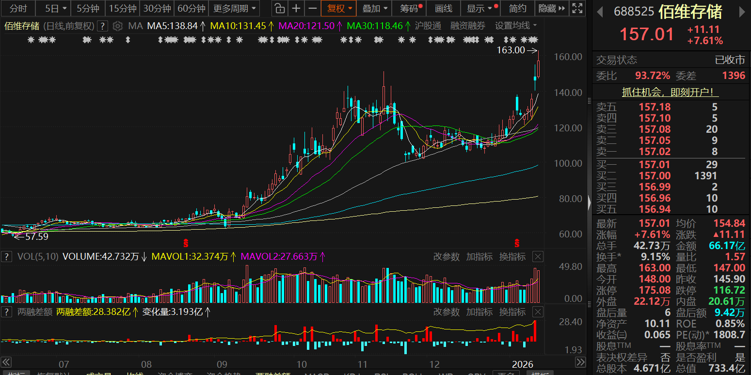 个股方面,佰维存储股价盘中最高冲至163元/股,刷新其上市以来的历史新高,截至日间收盘,佰维存储以7.61%的涨幅报157.01元/股。