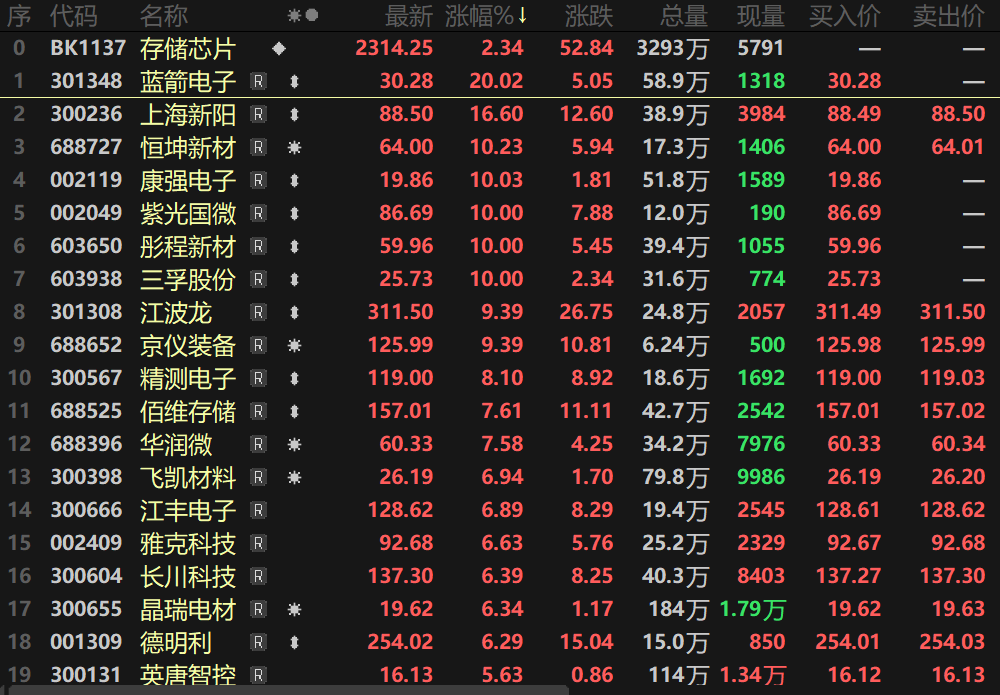 SMM 1月15日讯:1月15日午后开盘,半导体、存储芯片板块一同拉升,其中存储芯片指数盘中一度涨逾2%。个股方面,蓝箭电子盘中20CM涨停,康强电子、紫光国微、彤程新材、三孚股份等多股盘中一同封死涨停板,江波龙、佰维存储等多股纷纷跟涨。其中佰维存储股价盘中最高涨至163元/股,刷新其上市以来的历史新高。