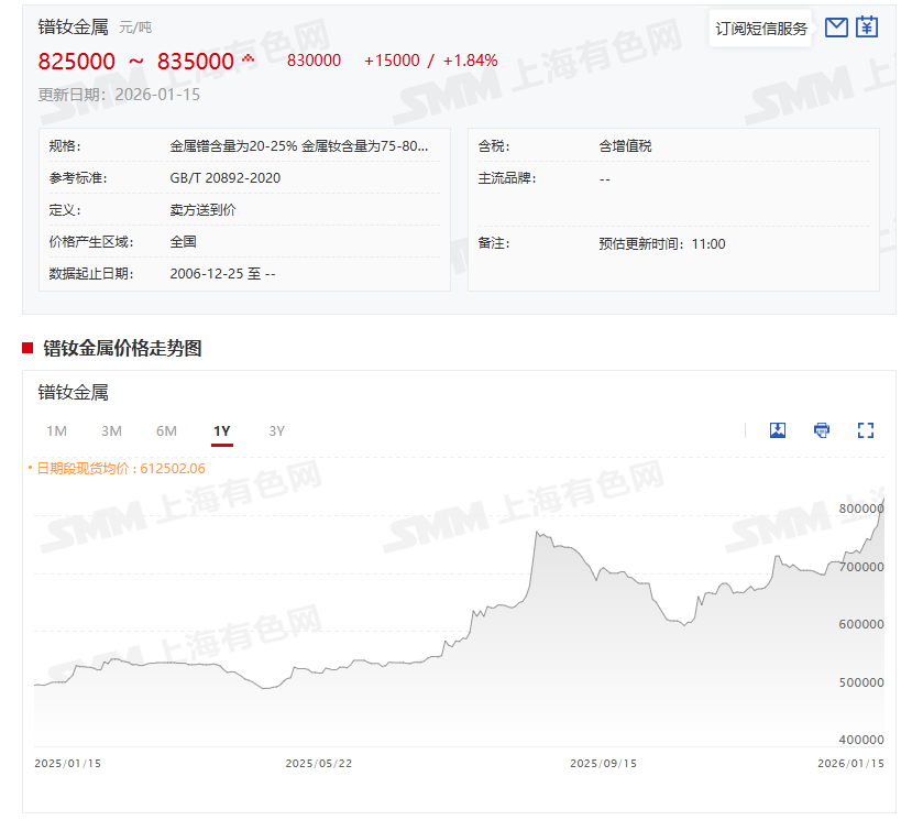 据SMM报价显示:1月15日,SMM镨钕金属价格为825000~835000元/吨,其均价为830000元/吨,较前一交易日上涨1.84%。