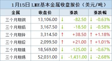 伦敦时间1月15日17:00(北京时间1月16日01:00),LME三个月期铜下跌82.5美元,或0.63%,收报每吨13,106.0美元。