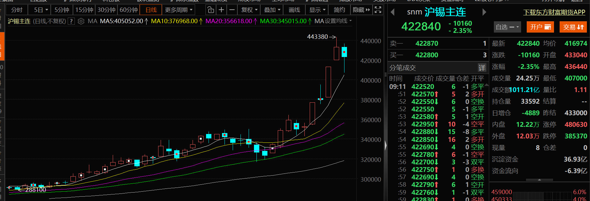 沪锡期货主力合约一度跌逾5%。伦锡期价跌逾4%。截至收盘,沪锡主力合约下跌3.27%。