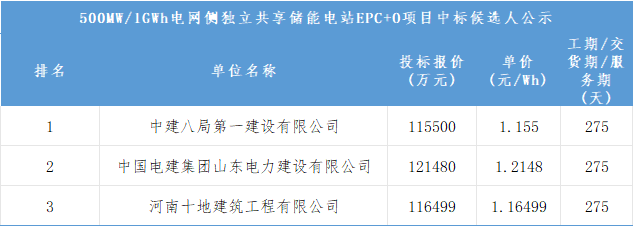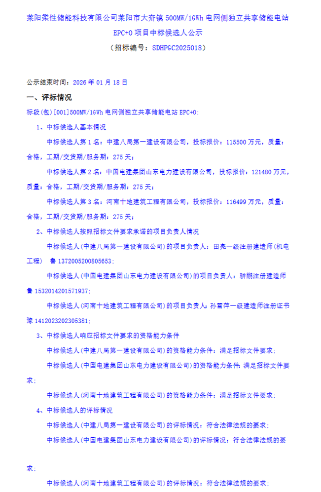 北极星储能网获悉,1月15日,莱阳柔性储能科技有限公司发布山东烟台莱阳市大夼镇500MW/1GWh电网侧独立共享储能电站EPC+O项目中标候选人公示,其中,中标候选人第一名为中建八局第一建设有限公司,投标报价115500万元,约合单价1.155元/Wh;中标候选人第二名为中国电建集团山东电力建设有限公司,投标报价121480万元,约合单价1.2148元/Wh;中标第三名为河南十地建筑工程有限公司,投标报价116499万元,约合单价1.16499元/Wh。