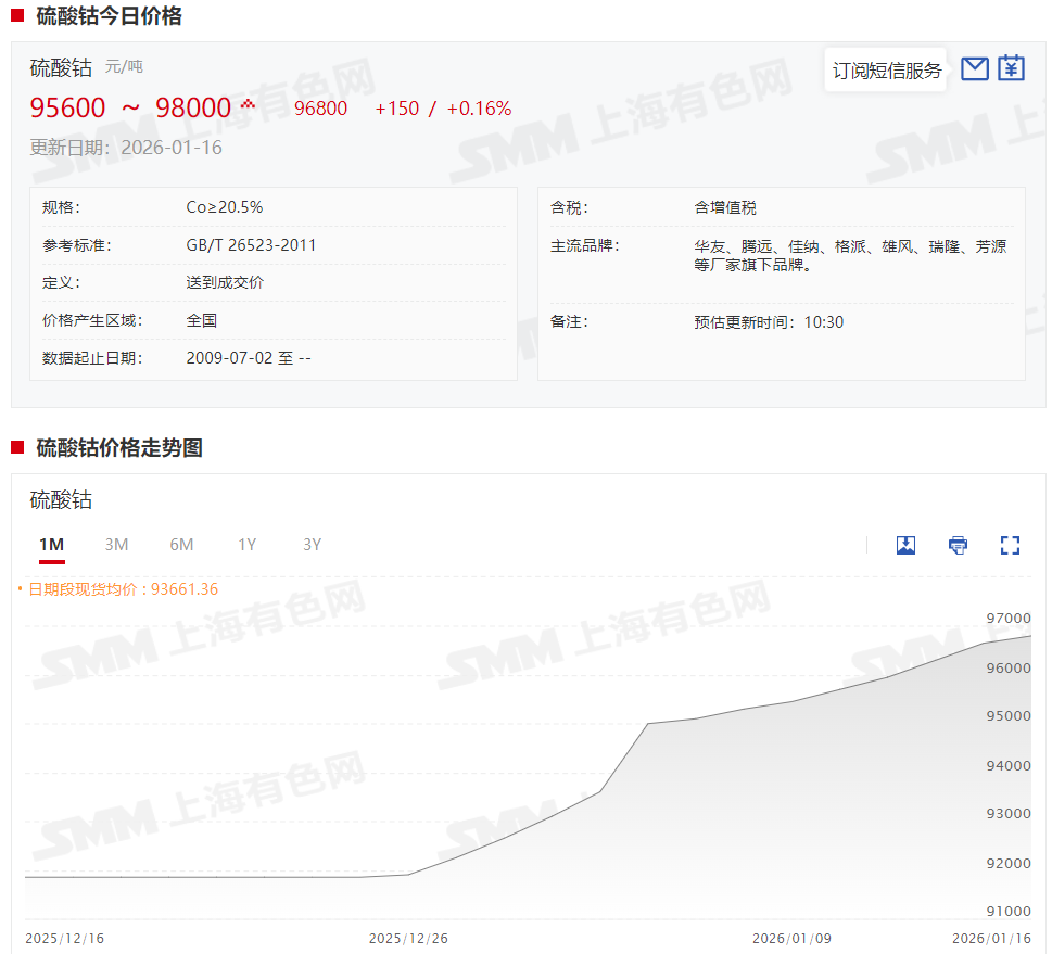据SMM现货报价显示,本周硫酸钴现货报价接连上探,截至1月16日,硫酸钴现货报价涨至9.56~9.8万元/吨,均价报9.68万元/吨,较1月9日上涨1350元/吨,涨幅达1.41%。