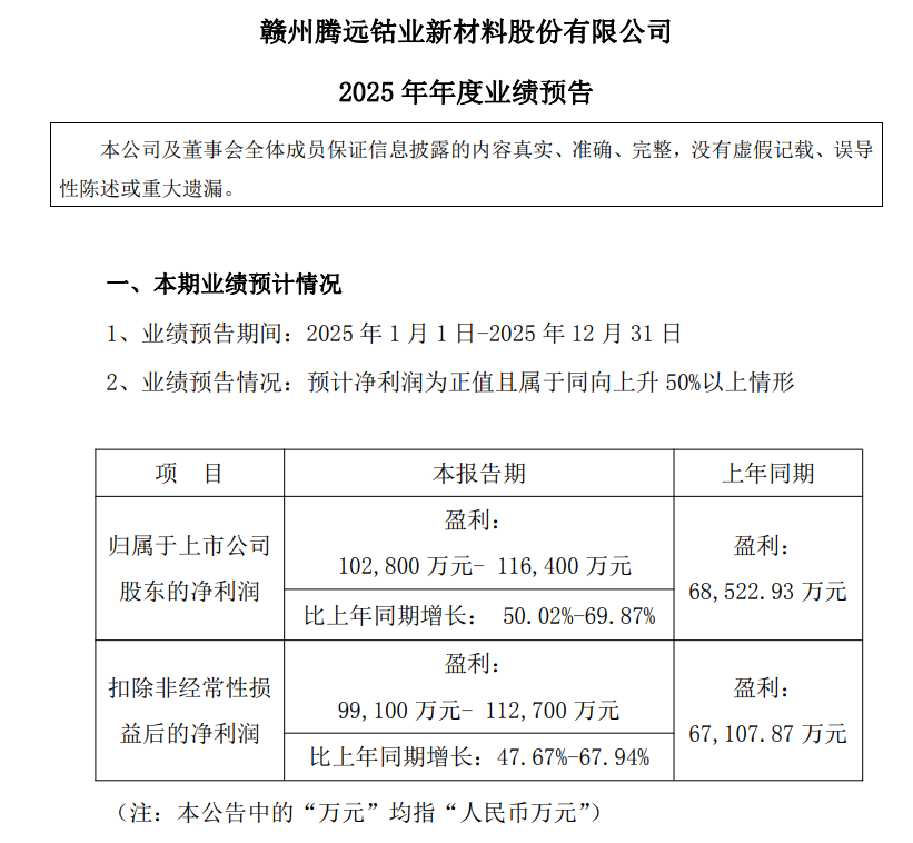 消息面上,腾远钴业1月13日发布2025年业绩预告,预计2025年归属于上市股东的净利润在10.28~11.64亿元,相比去年同期增长50.02%-69.87%。