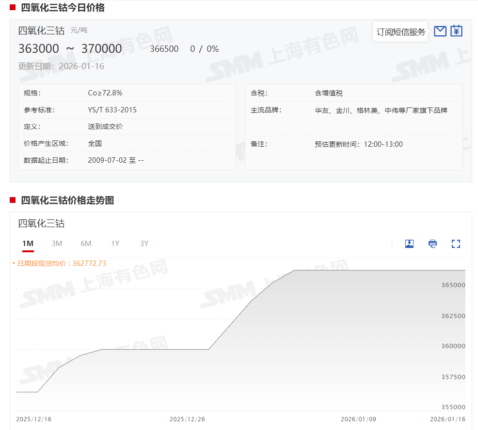 据SMM现货报价显示,本周四氧化三钴现货报价维持稳定,截至1月16日,四氧化三钴现货报价持稳于36.3~37万元/吨,均价报36.65万元/吨,与1月9日报价持平。