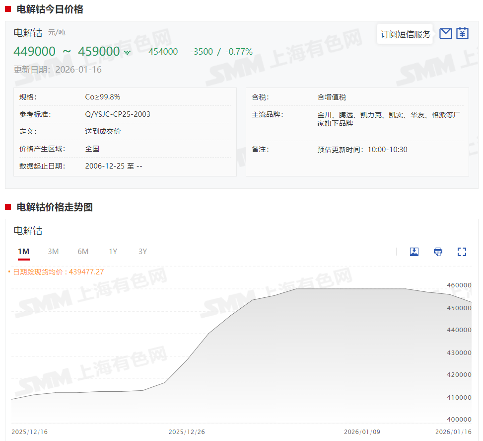 据SMM现货报价显示,本周电解钴现货价格震荡下行,截至1月16日,电解钴现货报价在经历接连三个交易日的下跌之后,报44.9~45.9万元/吨,均价报45.4万元/吨,较1月9日下跌6000元/吨,跌幅达1.3%。