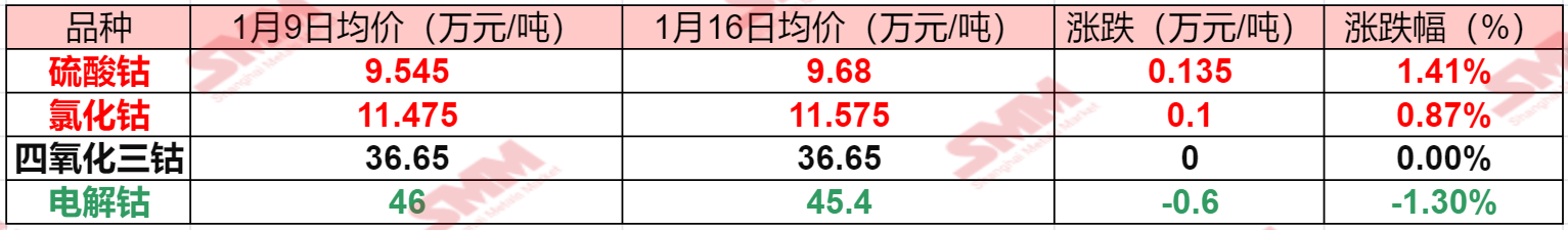 SMM 1月16日讯:本周钴系产品现货报价互有涨跌,电解钴现货报价震荡下行,但钴盐价格表现依旧可圈可点,硫酸钴冶炼厂依旧维持挺价,氯化钴市场流通货源逐步收紧…….SMM整理了本周钴市场相关产品的价格变动情况,具体如下: