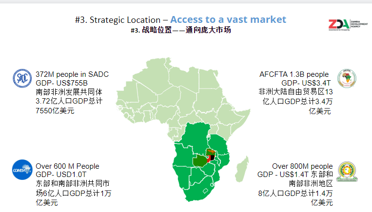 广阔的市场:赞比亚的战略位置,作为东南非共同市场、南部非洲发展共同体和非洲自由贸易区等区域贸易集团的成员资格,为进入一个巨大的区域市场提供了机会。