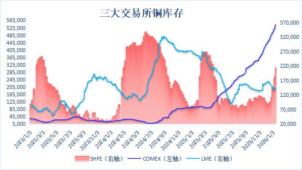 以下为2026年1月以来三大交易所铜库存数据:(单位:吨)