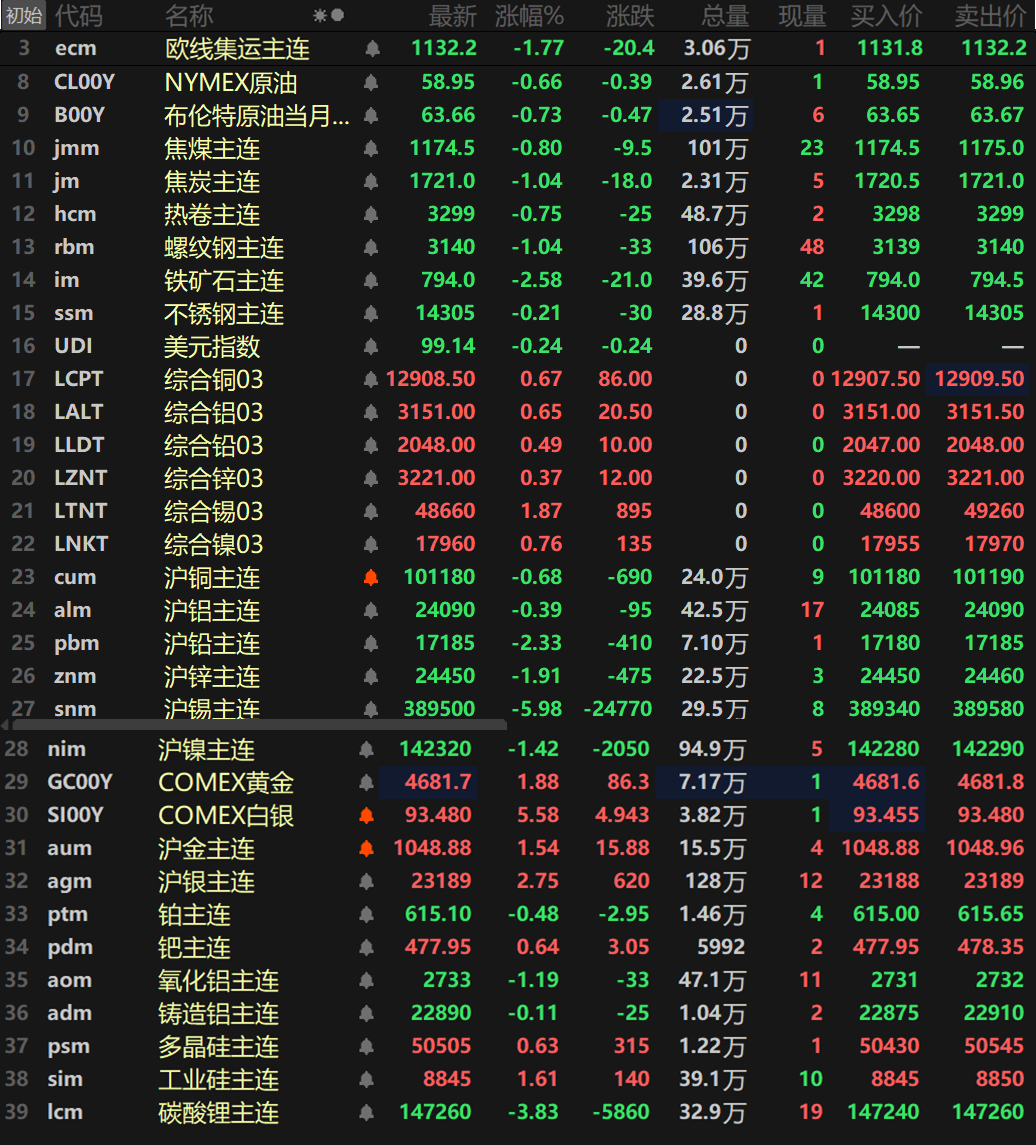 此外,碳酸锂主连跌3.83%,工业硅主连涨1.61%,多晶硅主连涨0.63%。欧线集运主连跌1.77%报1132.2。