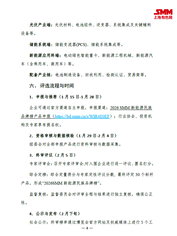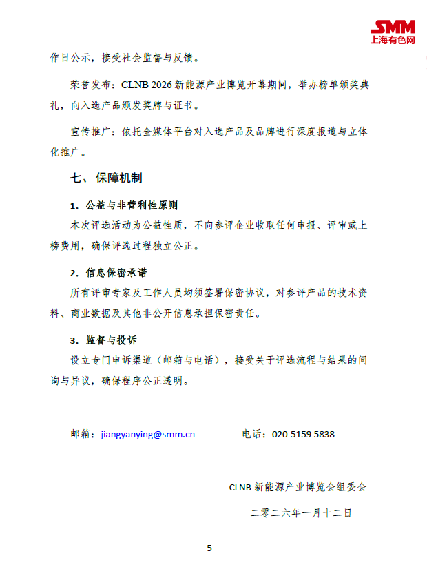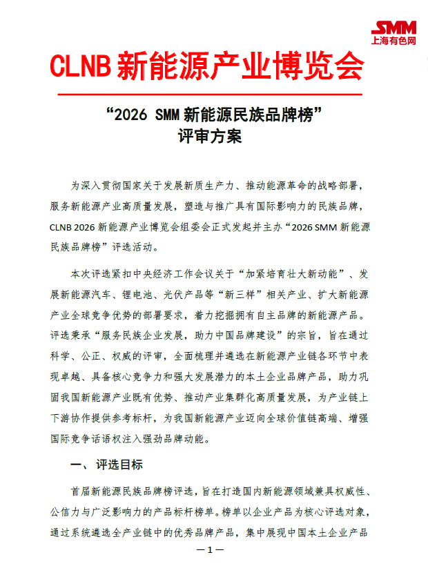 为响应国家 “加紧培育壮大新动能”“增强中国品牌全球影响力” 的战略部署,承接产业对优质产品标杆的迫切需求,SMM旗下 CLNB 2026 新能源产业博览会组委会,正式发起 “2026SMM新能源民族品牌榜” 评选活动。