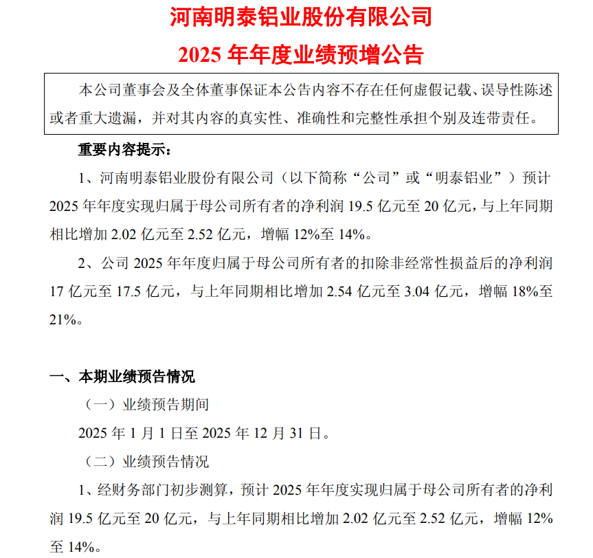 近日,明泰铝业发布2025年业绩预告,公告显示,公司2025年归属于上市公司股东的净利润在19.5亿元至20亿元,与上年同期相比增加2.02亿元至2.52亿元,增幅12%至14%。