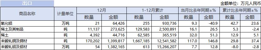 中国12月氧化铝出口量为21万吨,同比增加9.3%。1-12月累计出口量为255万吨,同比增加42.7%。
