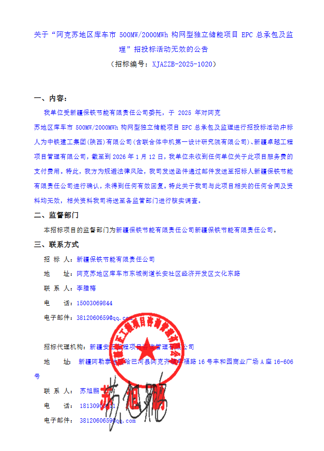 北极星储能网获悉,1月16日,新疆保铁节能有限责任公司发布“阿克苏地区库车市 500MW/2000MWh 构网型独立储能项目EPC总承包及监理”招投标活动无效的公告,公告提及,阿克苏地区库车市500MW/2000MWn 构网型独立储能项目EPC总承包及监理进行招投标活动中标人为中铁建工集团(陕西)有限公司(含联合体中机第一设计研究院有限公司)、新疆卓越工程项目管理有限公司,截至到2026年1月12日,未收到任何单位关于此项目服务费的支付费用。