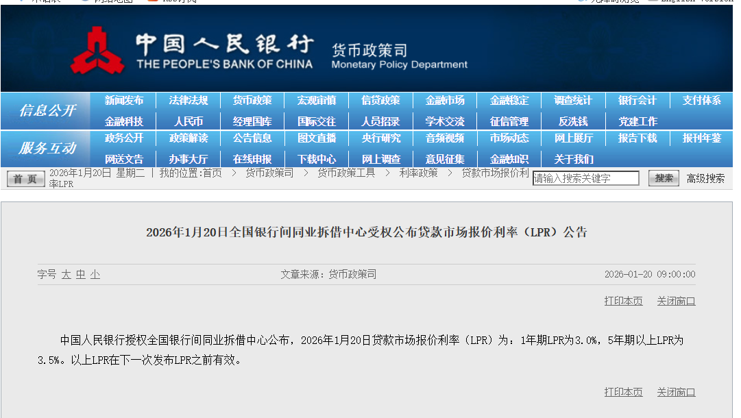 中国人民银行授权全国银行间同业拆借中心公布,2026年1月20日贷款市场报价利率(LPR)为:1年期LPR为3.0%(上月为3%),5年期以上LPR为3.5%(上月为3.5%)。以上LPR在下一次发布LPR之前有效。