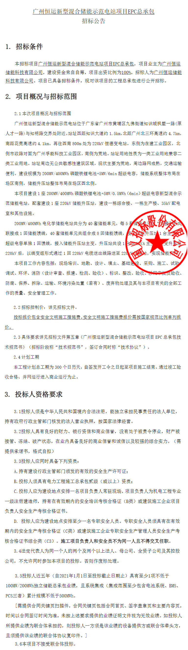 北极星储能网讯:2026年1月17日,广州恒运储能科技有限公司发布广州恒运新型混合储能示范电站项目EPC总承包招标公告,建设资金来自自筹,项目出资比例为100%,计划总工期为300个日历天。