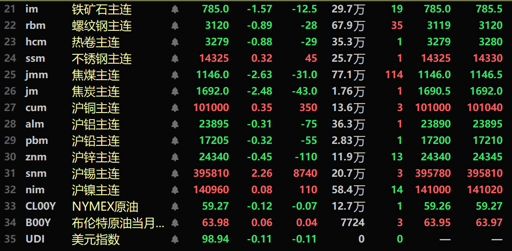 黑色系多飘绿,铁矿跌1.52%,螺纹跌0.89%,热卷跌0.88%,不锈钢涨0.32%。双焦方面:焦煤主力合约跌2.63%,焦炭主力合约跌2.48%。