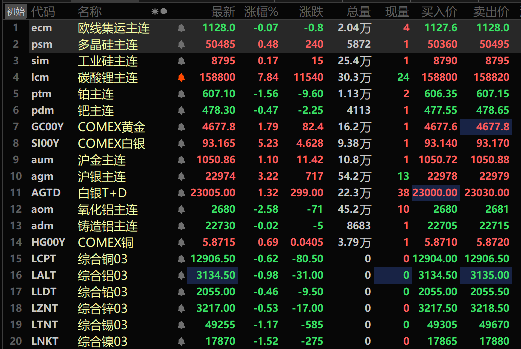 此外,铸造铝主连期货跌0.02%,氧化铝主连跌2.58%。碳酸锂主连涨7.84%。工业硅主连涨0.17%。多晶硅主连涨0.48%。