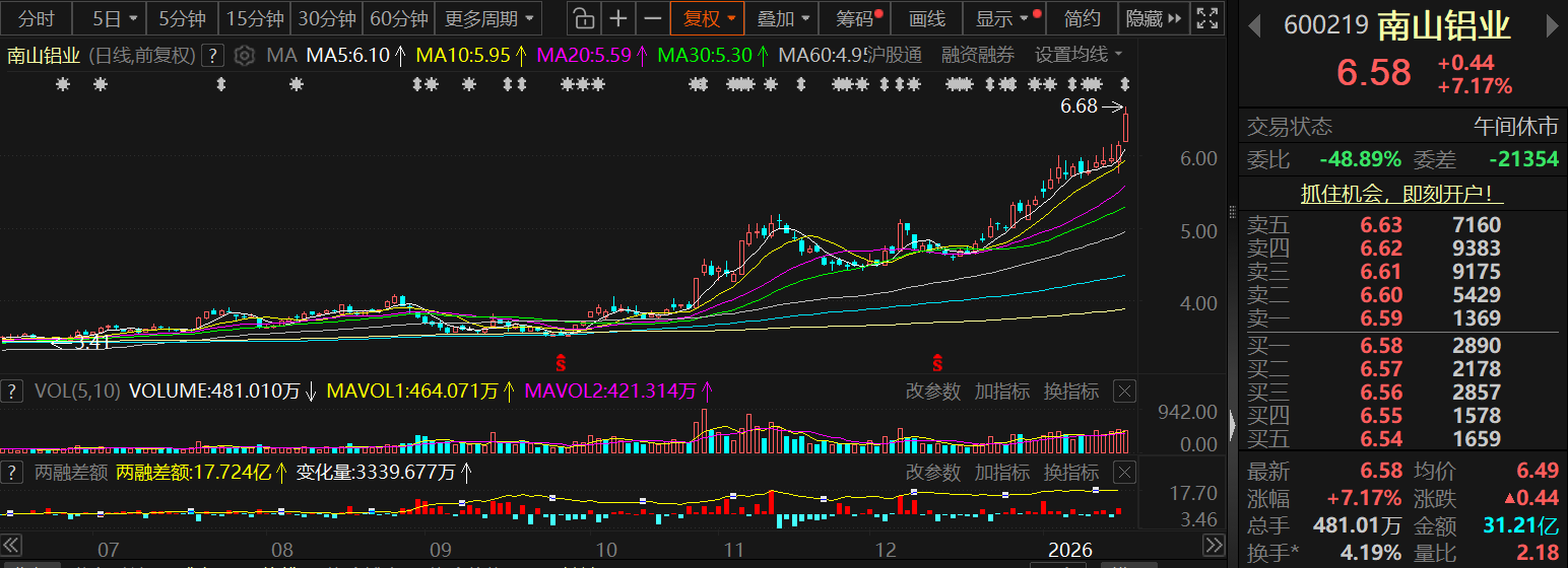 受此消息刺激,1月20日南山铝业开盘快速拉涨,盘中一度拉涨7.98%,最高触及6.68元/股,刷新2028年3月以来的新高。截至日间收盘,南山铝业以7.17%的涨幅报6.58元/股。