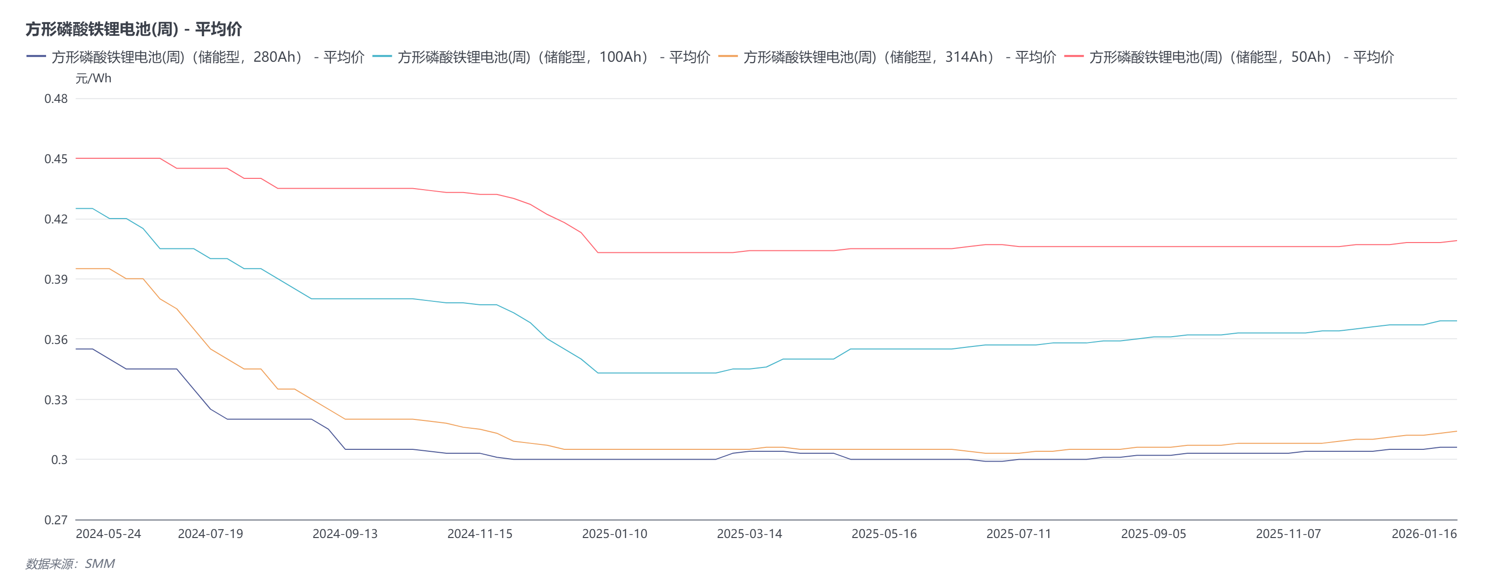 而进入2026年以来,储能电芯价格依旧持续上涨,以储能型280Ah方形磷酸铁锂电池(周度)报价来看,截至2026年1月16日,其现货报价涨至0.2778~0.334元/Wh,均价报0.306元/Wh,相较2025年12月31日的0.305元/Wh上涨0.001元/Wh,涨幅达0.33%。