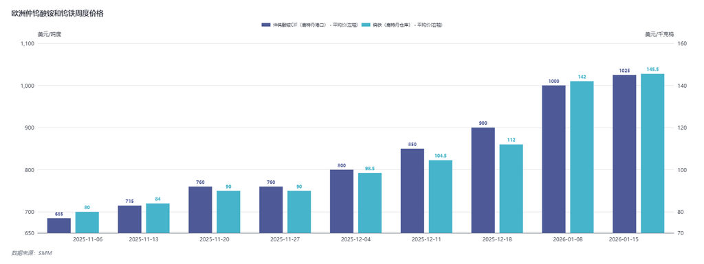 截至上周五,SMM数据显示,仲钨酸铵(APT)CIF鹿特丹港口价格为1000-1050美元/吨度,均价1025美元/吨度,较1月8日上涨25美元/吨度;钨铁(鹿特丹仓库)价格为142-149美元/千克钨,均价145.5美元/千克钨,较1月8日上涨3.5美元/千克钨。