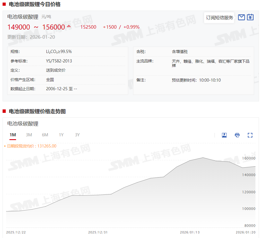 至于锂盐价格方面,以电池级碳酸锂价格为例,截至1月20日,电池级碳酸锂现货报价涨至14.9~15.6万元/吨,均价报15.25万元/吨。