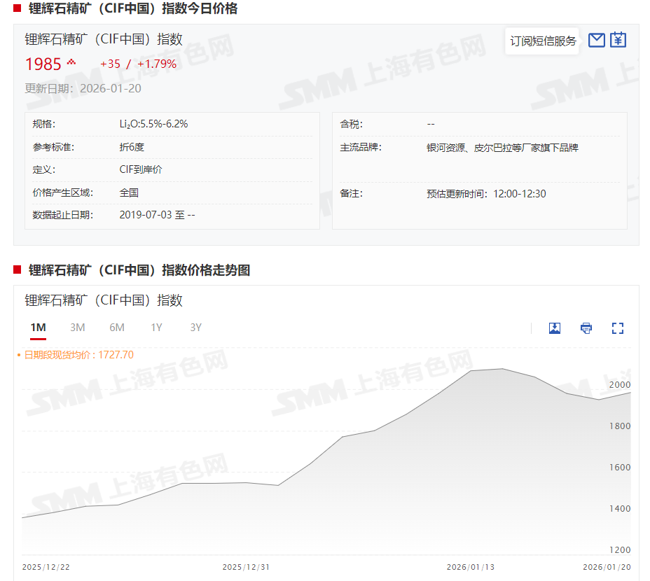 锂辉石精矿(CIF中国)方面,截至1月20日,其现货报价涨至1985美元/吨。