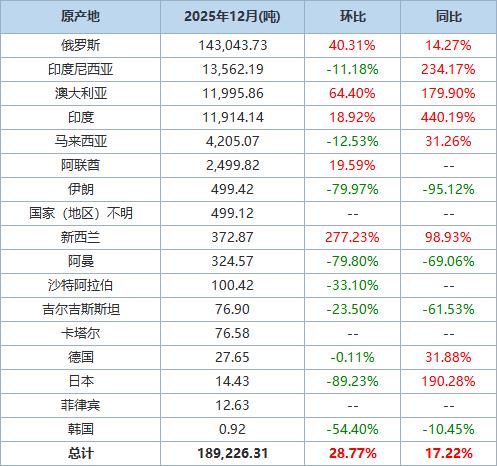 以下为根据海关总署官网数据整理的2025年12月原铝进口分项数据一览表: