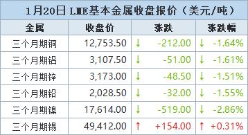 伦敦时间1月20日17:00(北京时间1月21日01:00),LME三个月期铜下跌212美元,或1.64%,收报每吨12,753.5美元。前一交易日上涨1.3%。