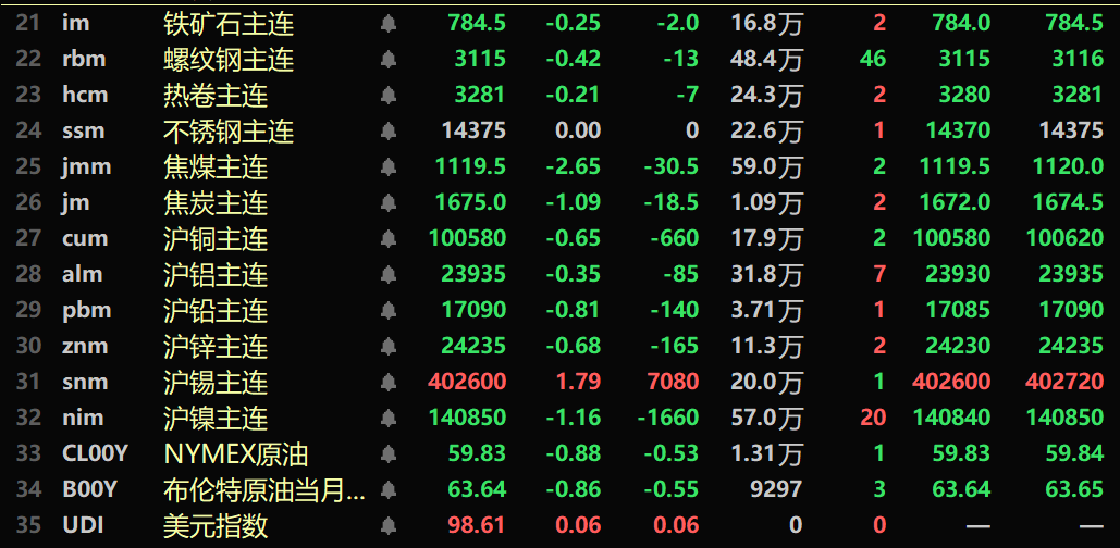 黑色系多飘绿,铁矿跌0.25%,螺纹跌0.42%,热卷跌0.21%,不锈钢平于14735元/吨。双焦方面:焦煤主力合约跌2.65%,焦炭主力合约跌1.09%。