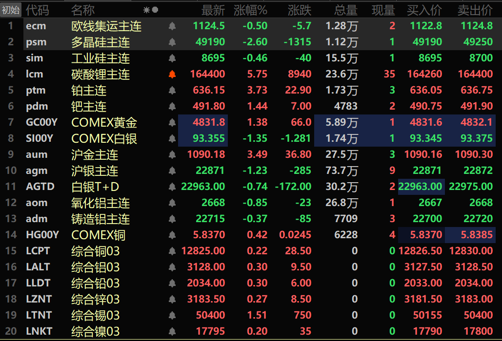 此外,铸造铝主连期货跌0.37%,氧化铝主连跌0.85%。碳酸锂主连涨5.75%。工业硅主连跌0.46%。多晶硅主连跌2.6%。