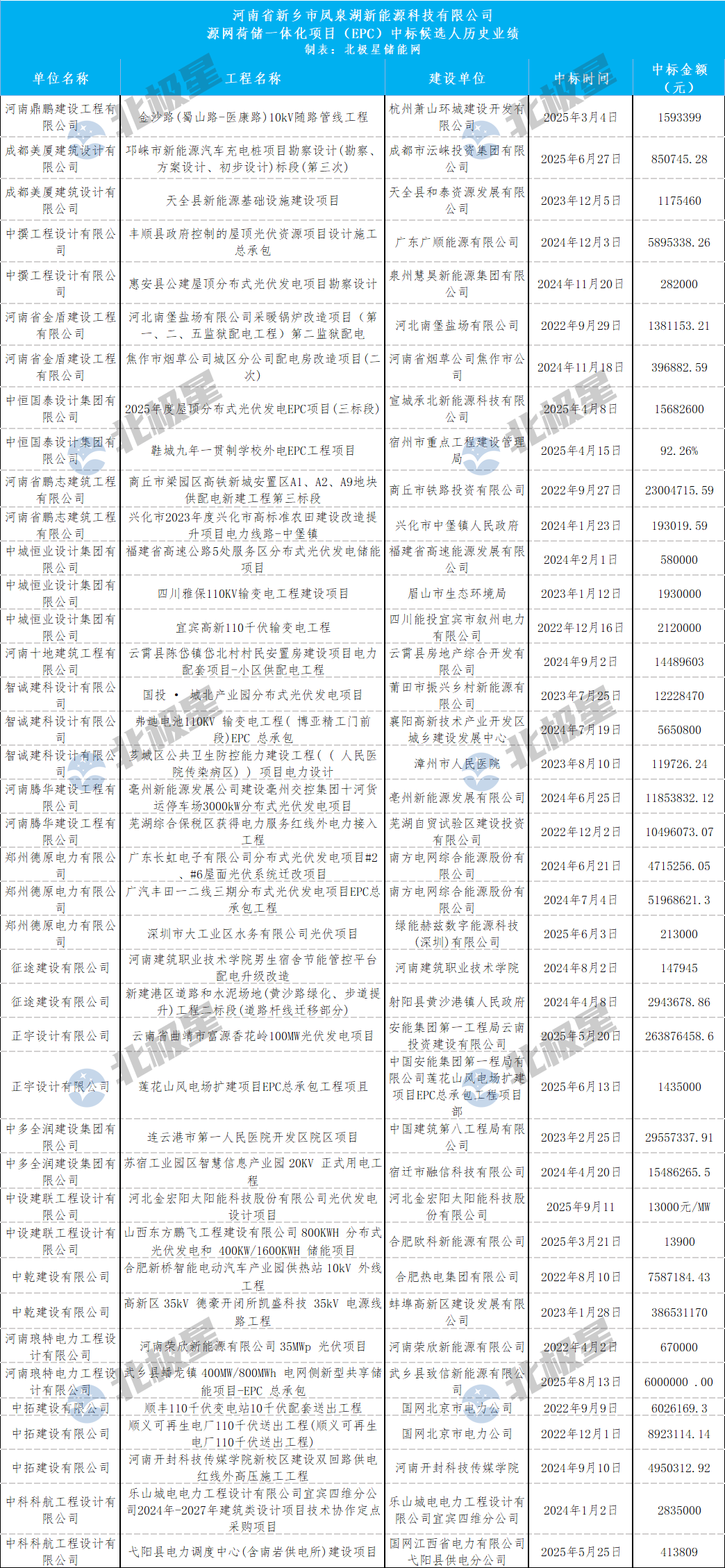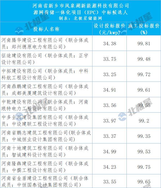 北极星储能网获悉,1月14日,河南省新乡市凤泉湖新能源科技有限公司源网荷储一体化项目EPC中标候选人公示,共有10家联合体投标入围,投标均价为34元/kWp。