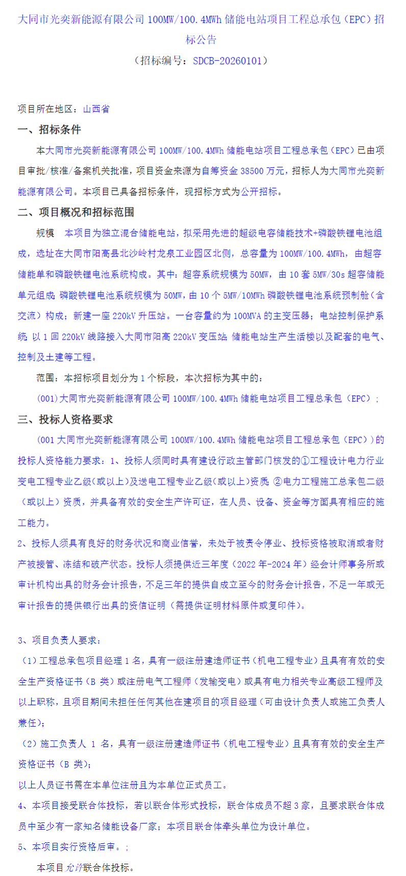 山西省大同市光奕新能源有限公司100MW/100.4MWh储能电站项目工程总承包(EPC)