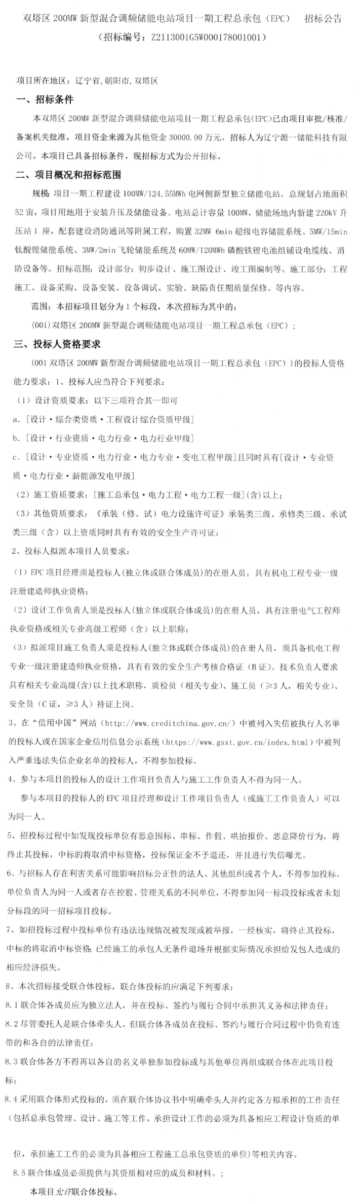 辽宁朝阳市双塔区200MW新型混合调频储能电站项目一期工程总承包(EPC)