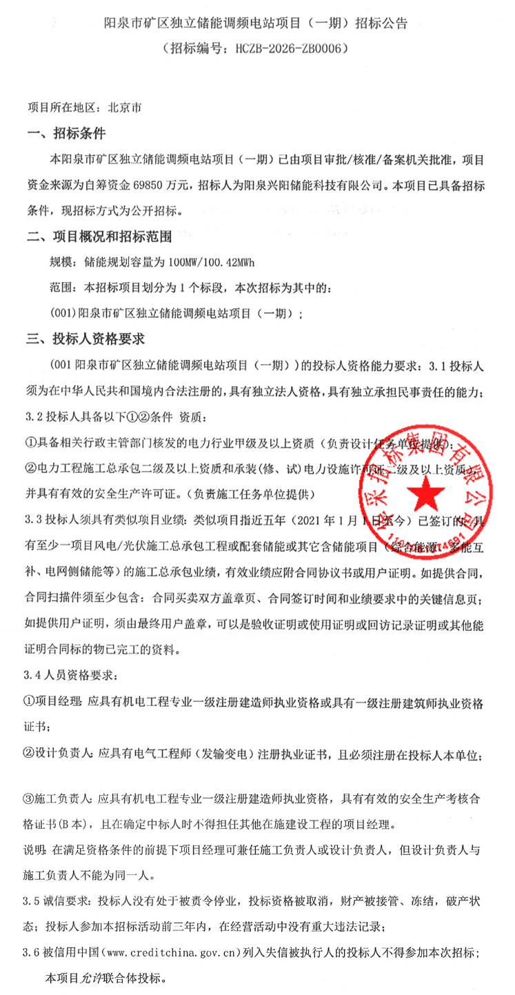 北极星储能网讯:近期,全国多地迎来三大调频储能电站的招标热潮。山西、辽宁、北京等地三大独立储能调频电站陆续公开招标,总规模达300MW/325.37MWh。三个项目均接受联合体投标,须满足相关条件。