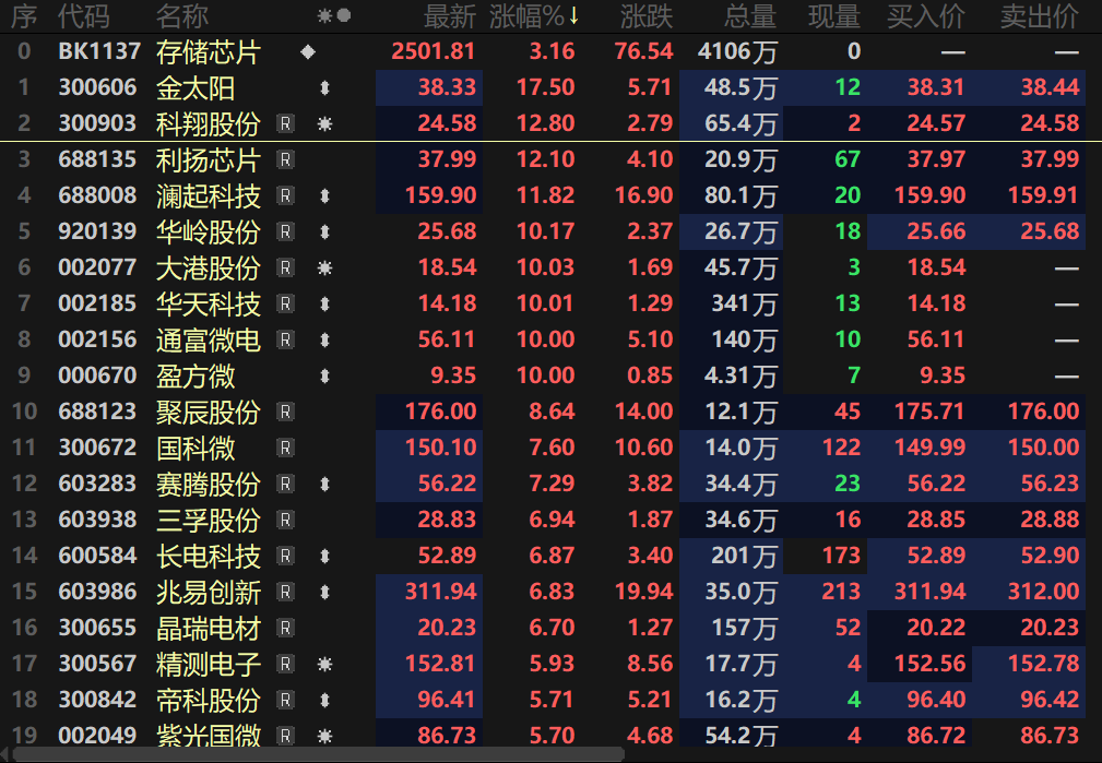 存储芯片板块指数今日盘中一度涨逾3%,金太阳盘中一度涨逾17%,澜起科技等多股盘中涨逾11%。