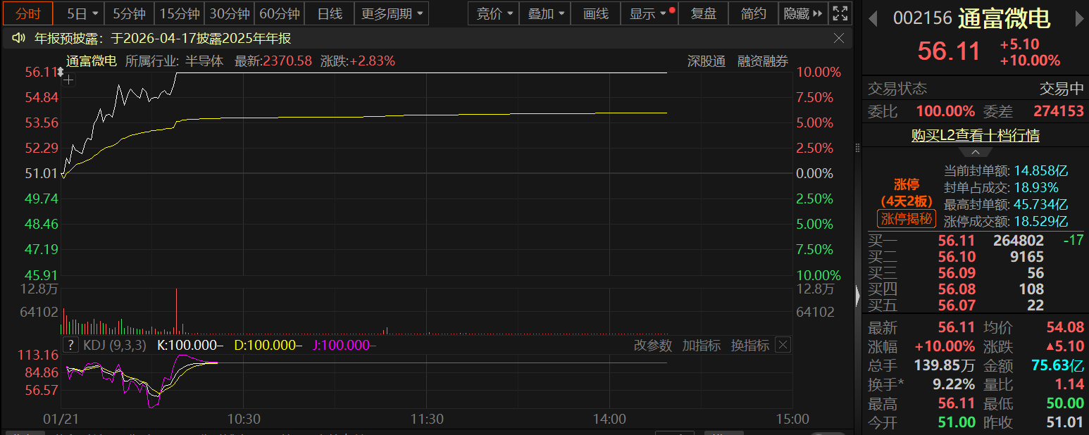 自1月16日以来,通富微电股价接连大幅上涨,公司1月20日晚间发布股票价格异常波动公告称,2026年1月16日、2026年1月19日、2026年1月20日连续三个交易日涨幅偏离值累计超过20%,根据深圳证券交易所相关规则,属于股票交易异常波动情况。1月21日盘中,通富微电盘中再度涨停,录得“四天两板”的战绩。