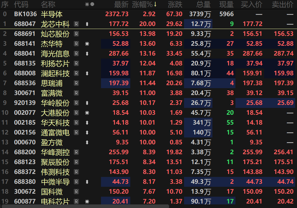 SMM1月21日讯:1月21日,半导体、存储芯片板块指数再度拉升,半导体指数盘中一度涨逾2%,个股方面,龙芯中科盘中20CM涨停,海光信息、华岭股份等多股盘中均涨逾10%,大港股份、通富微电、盈方微等多股盘中纷纷涨停。