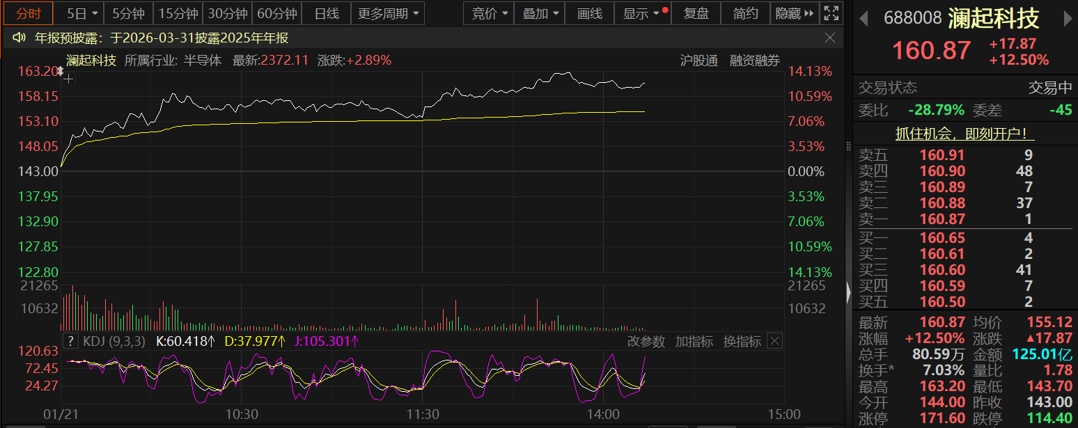 今日澜起科技股价盘中也一同大涨,最高一度涨逾12%。