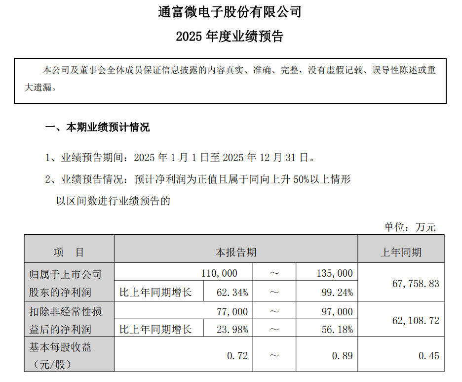 而身为国内领先,全球先进的集成电路封装测试服务提供商,通富微电也乘上了2025年半导体行业增长的东风,其预计2025年归属于上市公司股东的净利润在11~13.5亿元左右,相比去年同期增长62.34%~99.24%。