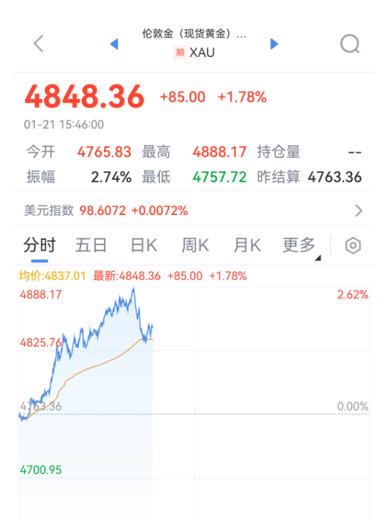 1月21日,伦敦金价格开盘后一路走高,一度触及4888.17美元/盎司,再创新高,随后直线下跌。与此同时,当日沪金期货主力合约2604在突破1100元/克后也开始回落,收盘报1092.3元/克。