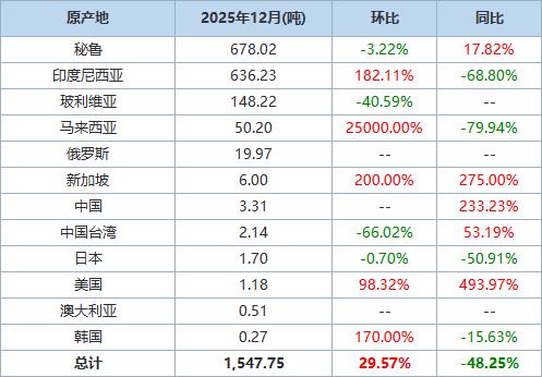 以下为根据中国海关总署官网数据整理的2025年12月精炼锡进口分项数据一览表:
