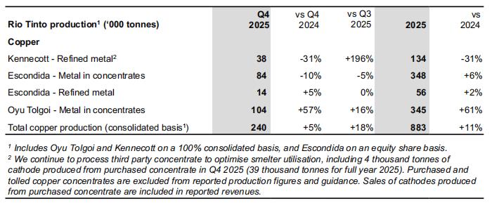 在埃斯孔迪达铜矿,由于品位降低和选矿厂产量减少,第四季度产量同比下降10%,但奥尤陶勒盖的产量同比增长57%,支撑了该集团的整体铜收益。