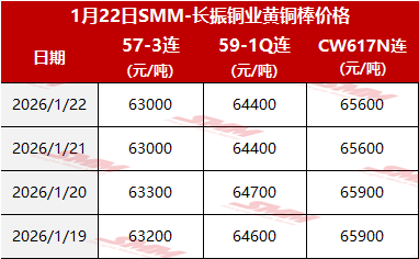 【SMM价格】2026年1月22日长振黄铜棒价格