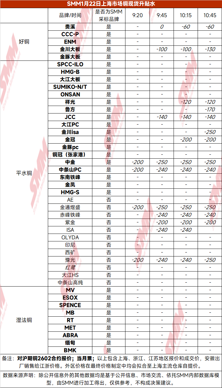 1月22日上海市场铜现货升贴水(第四时段)【SMM价格】