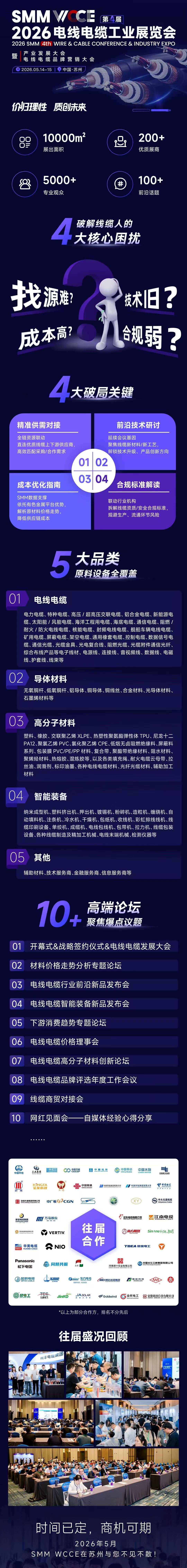 由上海有色网主办的SMM WCCE 2026电线电缆展将于5月14-15日在苏州举行。这场汇聚行业顶尖技术、优质供应商与行业精英的年度盛会,不仅是技术交流、商贸对接的核心平台,更是线缆人洞察行业趋势、链接优质资源的重要窗口!