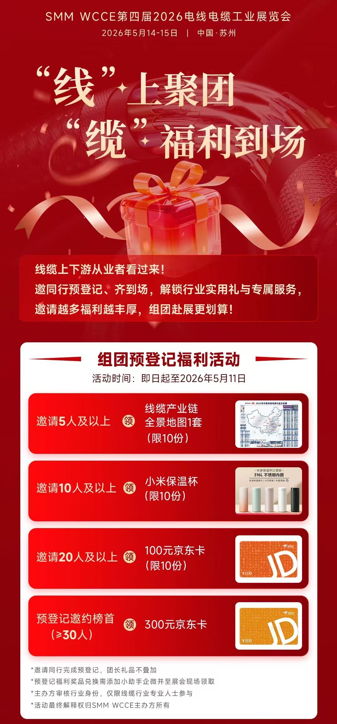 为了让更多线缆行业伙伴轻松赴约、满载而归,本届展会特别推出「‘线’上聚团・‘缆’福利到场」预登记+到场双重福利活动,逛展还能薅羊毛,这波必须冲!