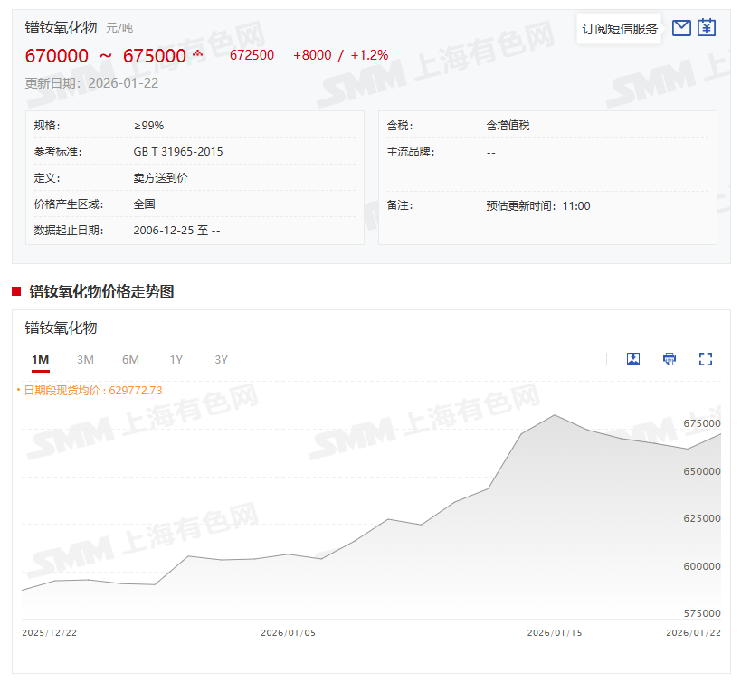 现货市场方面,在金属企业积极备货的推动下,镨钕价格有所回暖,其中:氧化镨钕1月22日的价格为670000~675000元/吨,其均价报672500元/吨,较前一交易日涨1.2%;镨钕金属1月22日的价格为805000~820000元/吨,其均价为812500元/吨,较前一交易日涨0.31%。