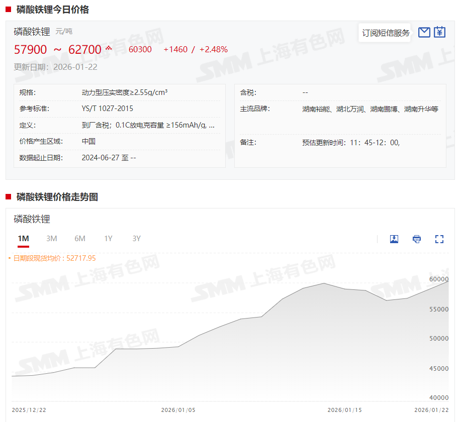 截至2026年1月22日,磷酸铁锂(动力型压实密度≥2.55g/cm³)现货报价涨至57900~62700元/吨,均价报60300元/吨。
