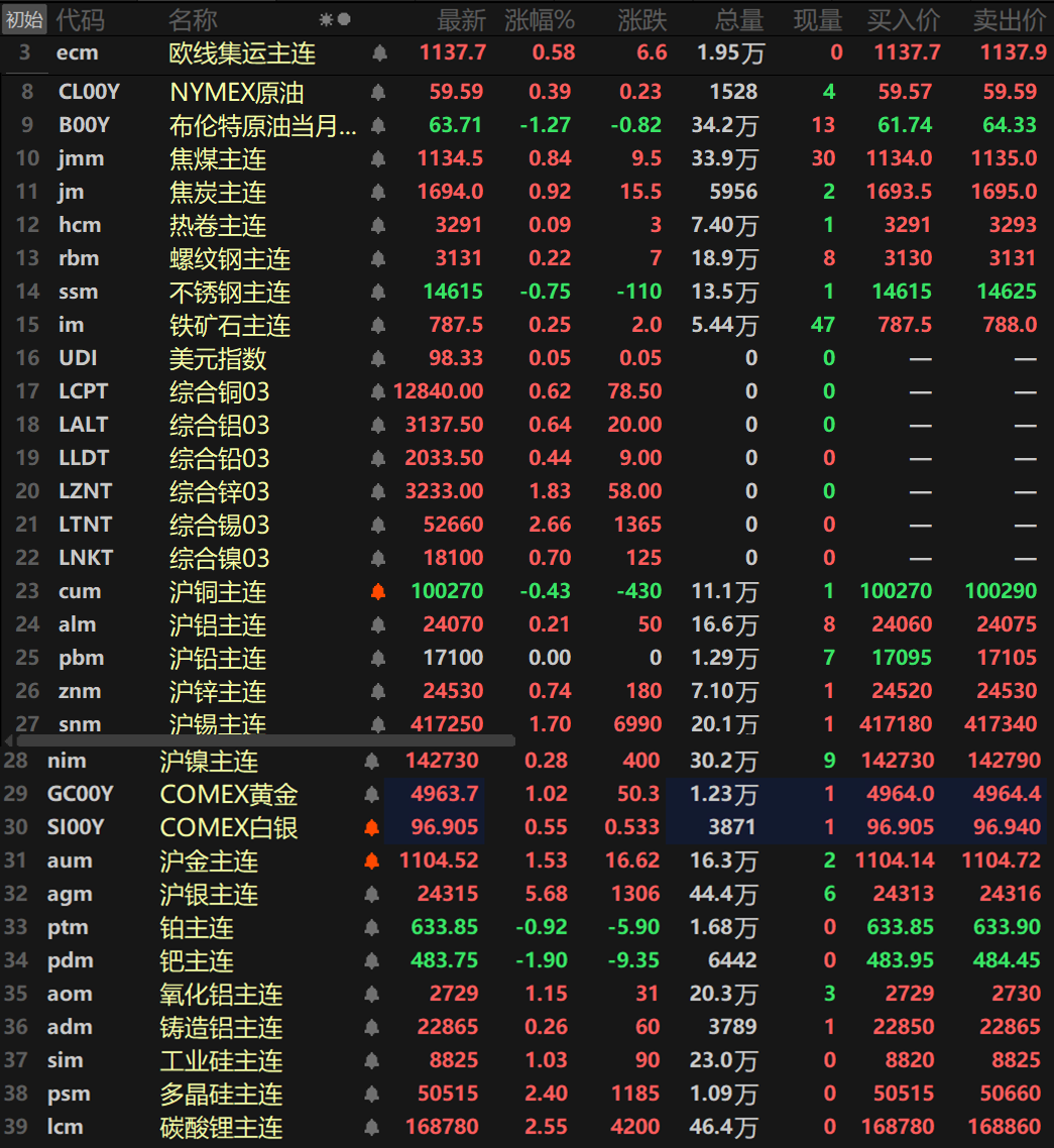隔夜贵金属方面,COMEX黄金涨2.09%,1月23日早间开盘继续拉涨,盘中最高冲至4965.4美元/盎司,继续刷新其上市以来的历史新高;纽银涨3.86%,1月23日早间同步拉涨,盘中最高冲至96.995美元/盎司,同样续刷历史新高。国内方面,沪金涨1.53%,盘中最高触及1106.24元/克的历史高位,沪银大涨5.68%,盘中最高触及24378元/千克,同样刷新历史记录。